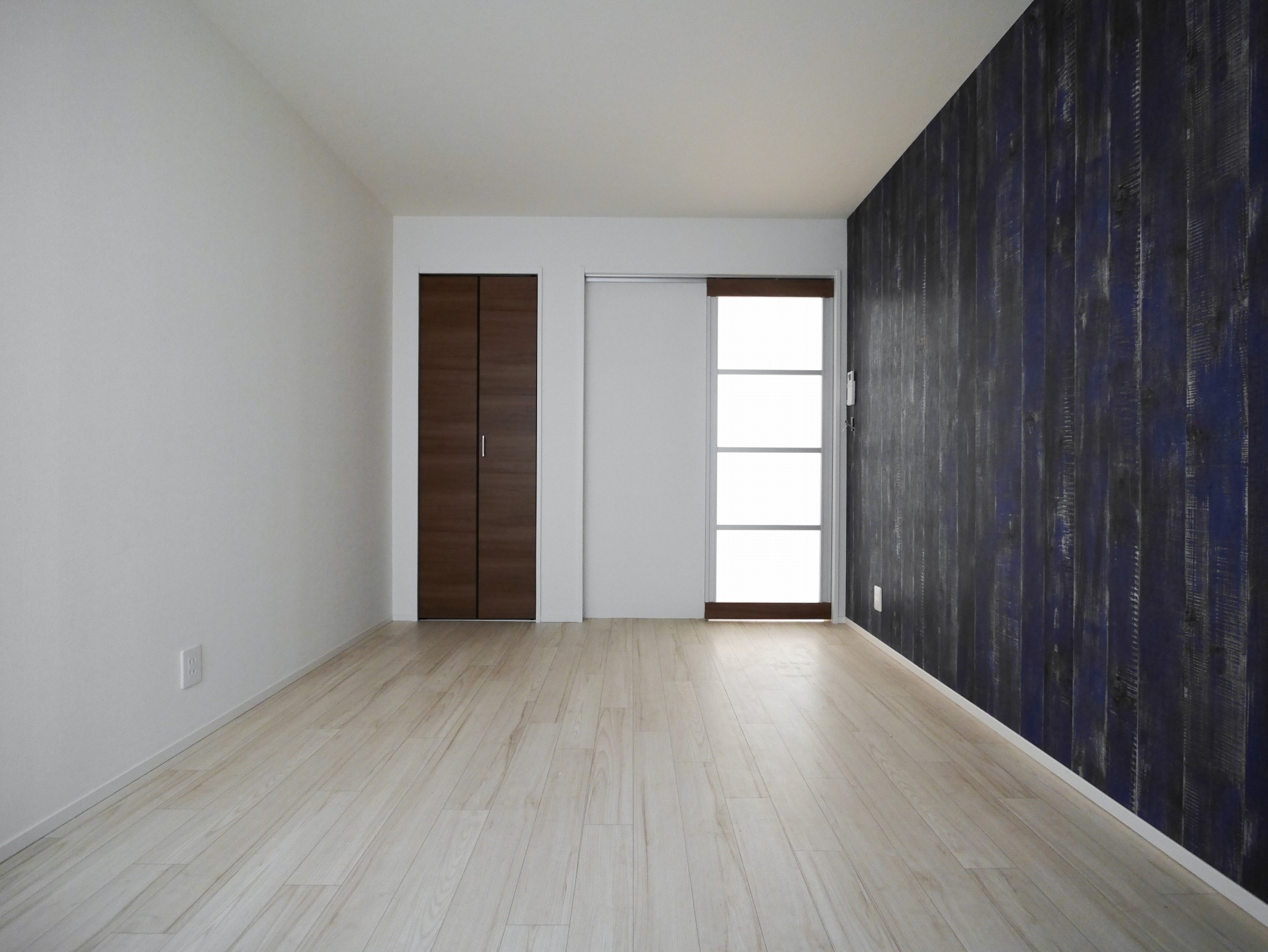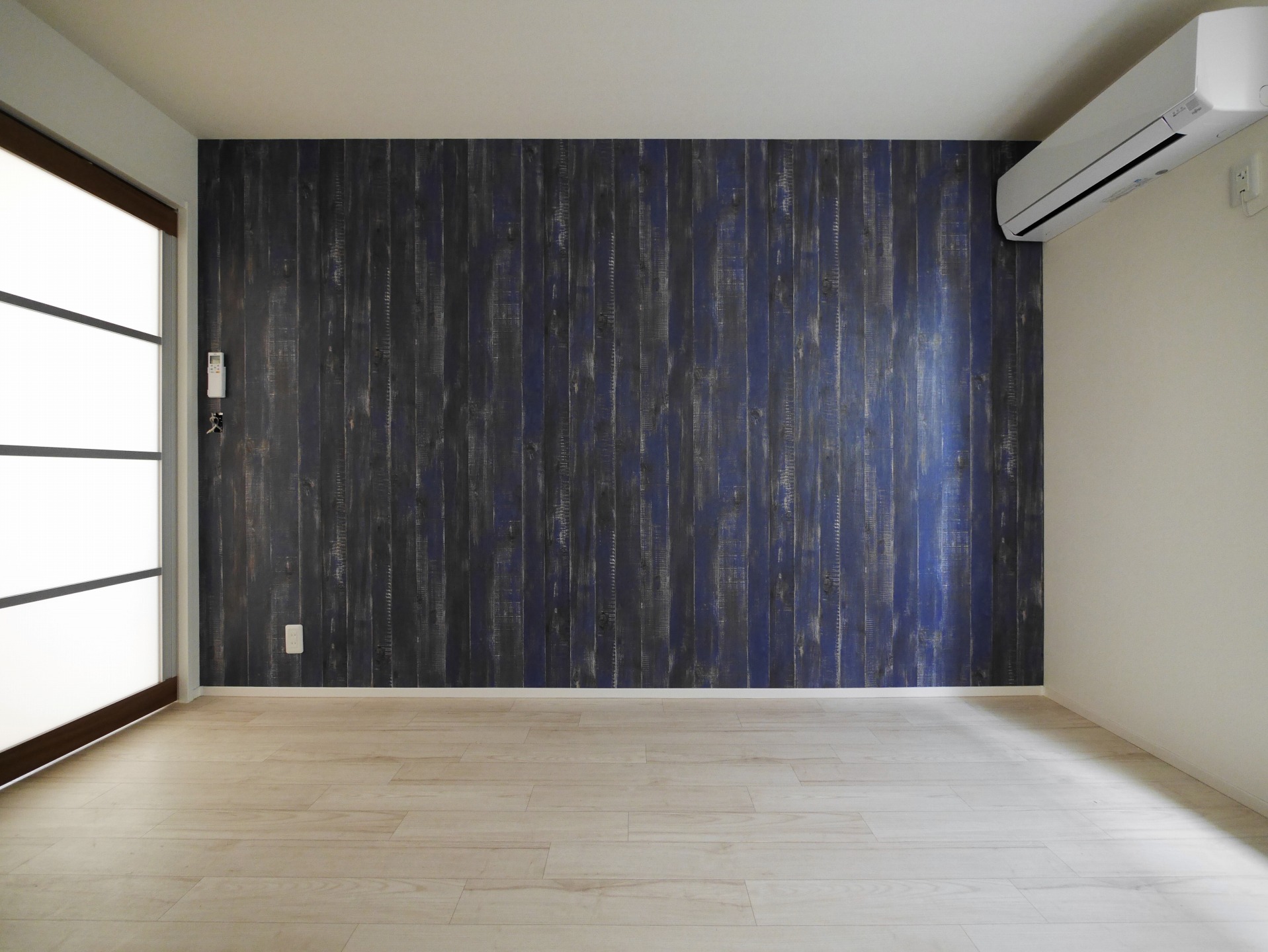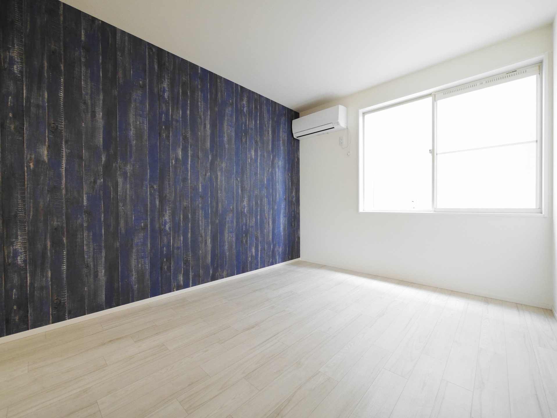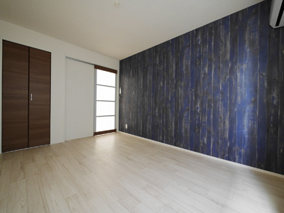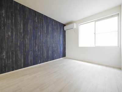 アクセントとしてLDKは水色のクロス、洋室は濃いブルーのヴィンテージ感のある木目調クロスでくつろぎと落ち着きの空間に。
