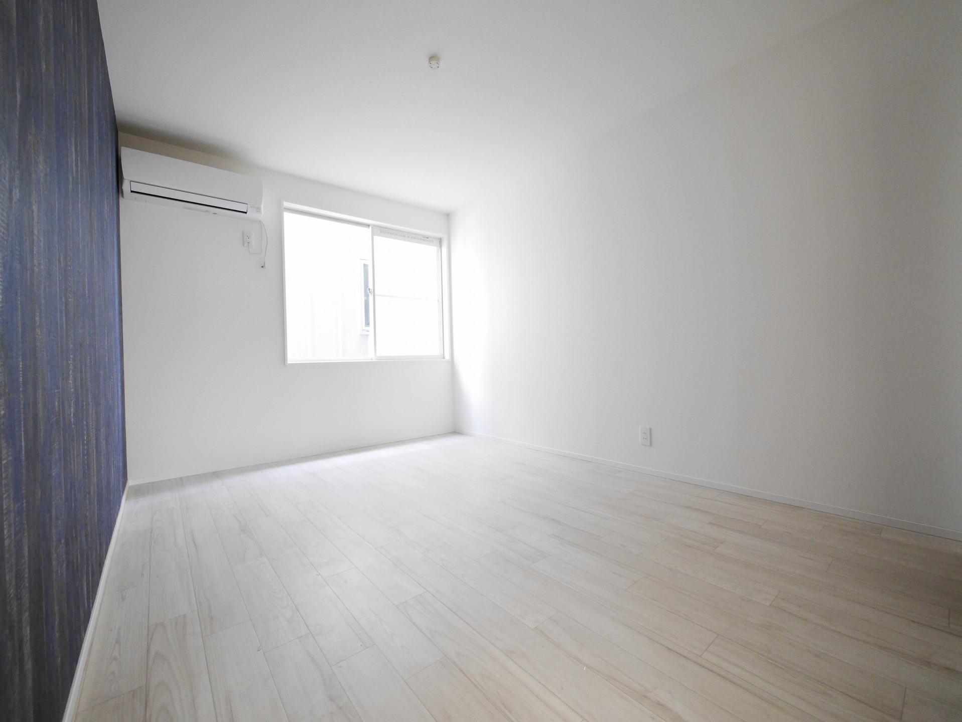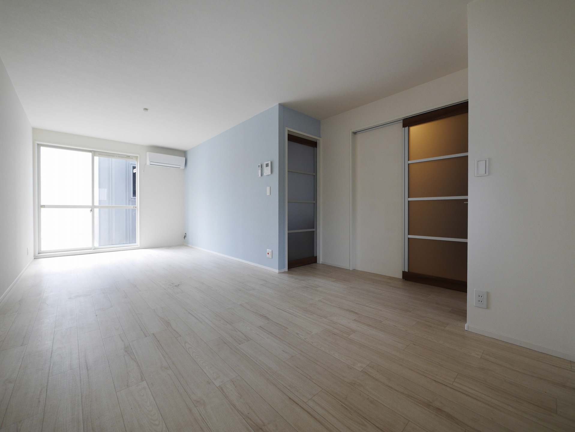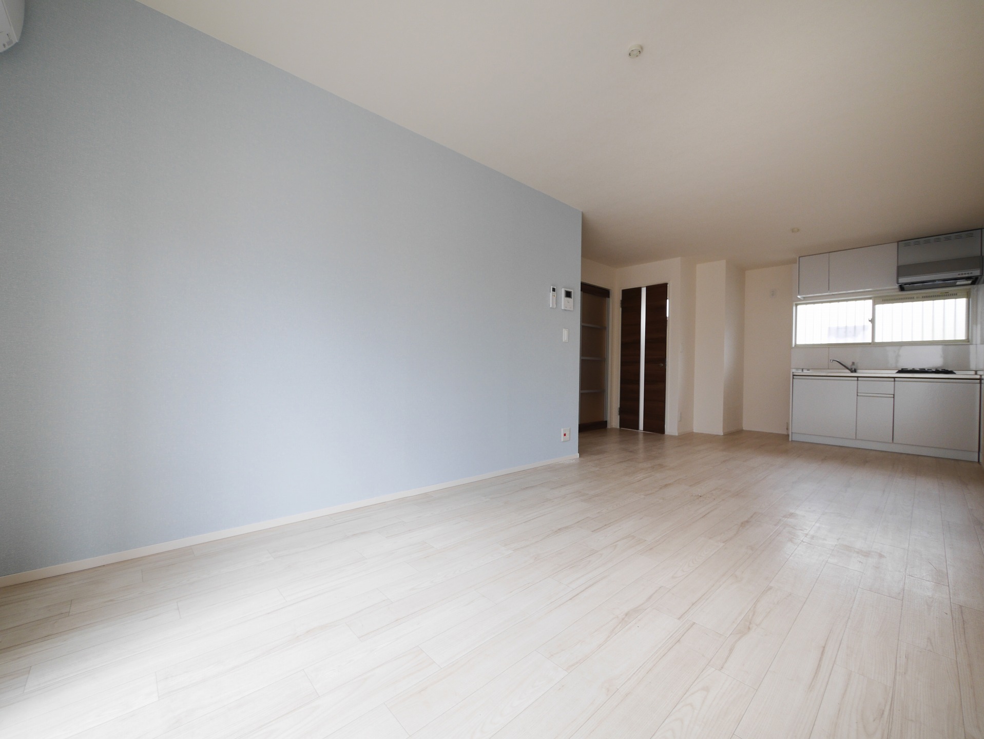 アクセントとしてLDKは水色のクロス、洋室は濃いブルーのヴィンテージ感のある木目調クロスでくつろぎと落ち着きの空間に。